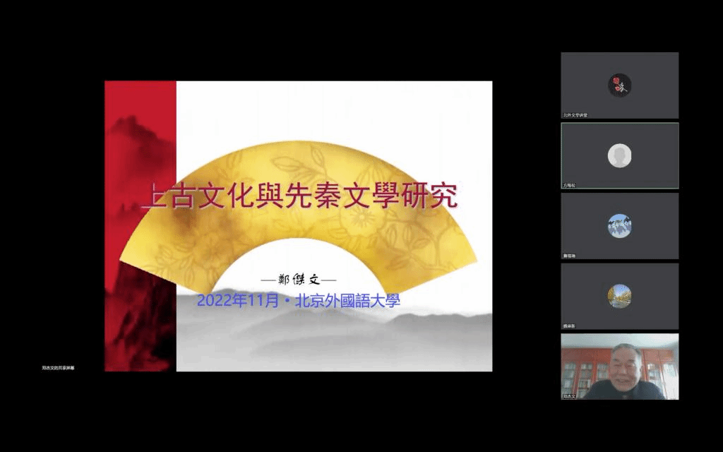 2022年11月10日下午,PA捕鱼官方网站举办“北外文华讲堂”系列讲座,邀请山东大学讲席教授、国家重点文化工程“全球汉籍合璧工程”首席专家郑杰文先生做题为《上古文化与先秦文学研究》的线上学术讲座。讲座由PA捕鱼官方网站魏崇新教授主持,PA捕鱼官方网站经理詹福瑞教授、副经理方稚松老师以及公司师生共一百余人参与此次讲座。