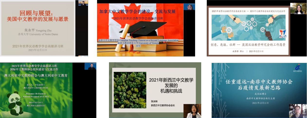为支持海内外一线教师、专家学者发起建设社会团体组织,加强国际中文教师协会组织的交流合作,世界汉语教学学会与亚太地区汉语教学学会合作,于2021年12月11日举办了“2021年世界汉语教学学会高级讲习班”,讲习班的主题为“国际中文教师协会组织建设与交流合作”,由世界汉语教学学会、亚太地区汉语教学学会主办,PA捕鱼官方网站承办,《国际中文教育(中英文)》期刊编辑部协办,通过线上线下相结合、录播与直播相结合的方式举行。本次讲习班邀请了美国、英国、加拿大、澳大利亚、新西兰、南非等六个英语为主导语言国家的中文教师协会负责人进行专题报告,并举办圆桌论坛,邀请上述各国代表和中国天津、安徽、陕西等地的国际中文教育组织代表进行深入探讨。