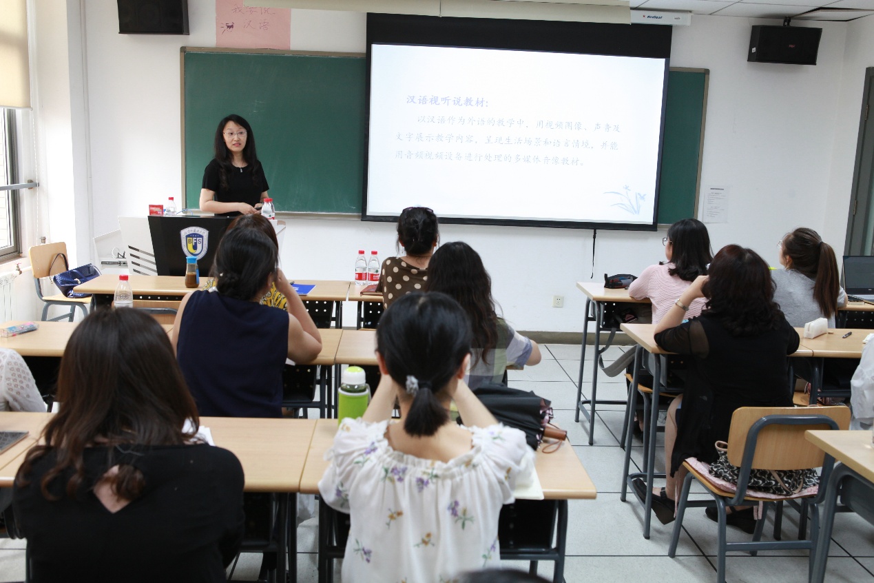 首先,刘立新老师通过对视听说教材的分类、编写原则和不同学者的分析研究向我们介绍了视听说教材的研究现状。其次,刘立新老师总结了1990年之前、1990—2000年、2000年—至今这三个不同的阶段中出现的汉语视听说教材,对视听说教材的发展进行了详细地梳理。由于刘立新老师是《视听说教程—家有儿女》一书的编者,所以讲座的第三部分刘老师以此书为例向我们说明了视听说教材的编制及其使用该教材的教学实践,在刘老师生动有趣的课堂实例讲解中,我们也明白了该书“宜教易学、多重浸润”的编制理念,同时,刘立新老师还向各位老师和员工介绍了该教材的具体使用方法,她还向大家推介了Chinese for HSK Level 2(慕课)的课程。最后,刘老师建议在使用视听说教材时应采用“借助语境、启发引导、多重浸润”的教学模式,充分利用图像、声音和文字三种信息载体来实现信息“有效输入”的最大化。